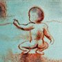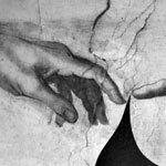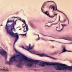 In many images, disembodied and almost cartoon-like tears hover over the figures. The stenciled silhouette of the fetus points to them on the face of a woman lying naked in a bathtub. Its outstretched finger is of course a glossing of Michelangelo's Sistine Chapel image of God creating Adam. But Badani's image, because of contemporary visual language, has a great affinity with Spielberg's E.T. I am referring to the scene at the movie's end when E.T.'s finger stretches out to touch the tip of the child's. This is a deliberate reference to Michelangelo as well. What unites all three images is that the pointing finger embodies a desire to generate connection, to produce a point of contact where creativity and the life force are activated.