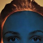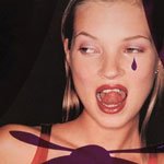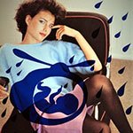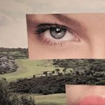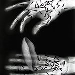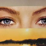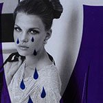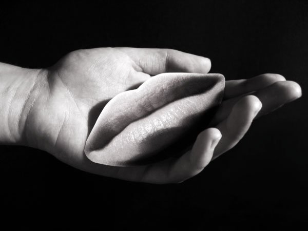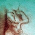 Disembodiment or alienation is a theme of the entire series. There is a fracturing of body parts – lips, tears, fetuses removed from the natural environment of the womb and thrust into the electronic bath of the blue screen. A naked woman cradles a screen womb and lips float around her. In another image perpendicular lips resembling a reed or a tree leaf collide with a woman’s nipple. A topsy turvy world where ethereal lips cannot drink from the promising breast. And look, in another image hands in a prayer position are poised to catch the floating lips, while in a companion piece the lips are cradled, composed like fallen leaves of a tree, or like pieces of an unresolved jigsaw puzzle. Stenciled tears hover above bodies and gently closed eyes.The recurring combination of alienation – the intrusion of the screen, echoes of a mass media’s exploitation of primal sensory experience – but also of care, hugging, holding, hands as safety nets, the need and ability of women to nurture despite the disjointedness is returned to over and over.
