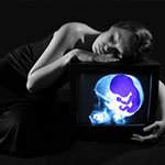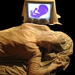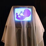 Of all the images, the ‘screen womb’ demands our greatest attention. In its simplicity – it is the frame in which the fetus floats, it is being hugged and held by women as an extension of their bodies, the unconscious projection of thoughts when it appears by their heads – lies its complexity. For though the electronic screen has become a staple of modern consciousness, we are still in the embryonic stage of our relationship to it. Yes, televisions are a fixture in most people’s lives. And yes, as part of the practice of medicine, they literally help physicians save lives. The electronic screen enables us to see what was off limits before, it has created an entire world of global communication, yet it also inhibits us by relying on virtual worlds, augmenting our inherent sense of alienation both from ourselves and from one another.